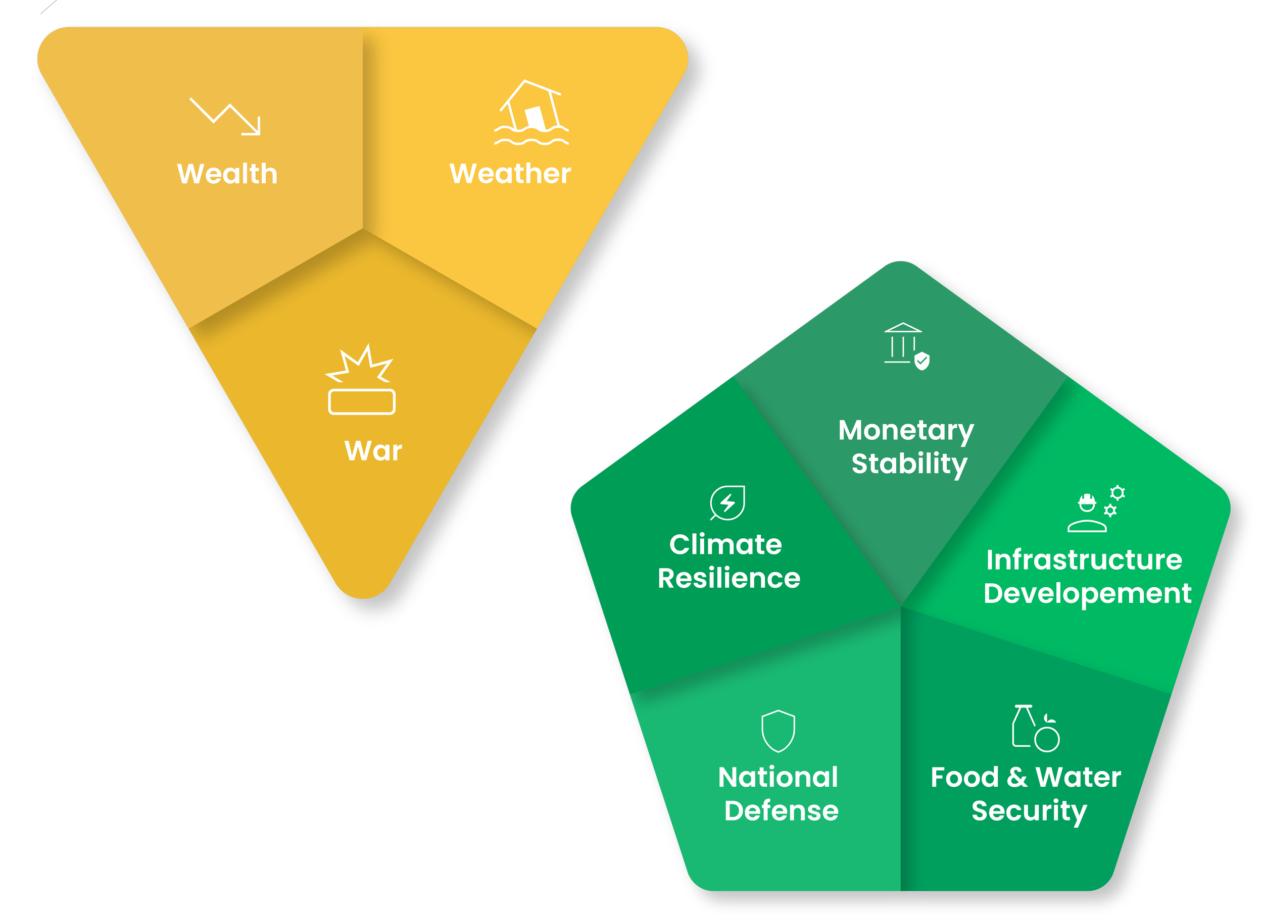 In an increasingly volatile world, three interconnected megathreats—wealth deterioration, extreme weather, and the risk of war—pose profound challenges to global stability. These threats in turn inform a set of actionable priorities, which are the foundations of our thematic investment strategy.
